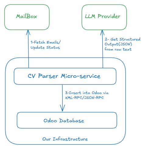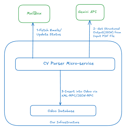 - Odoo Integration: Use Odoo XML-RPC to create a record in the recruitment module. We also attach the original PDF so the recruiter has a reference if the AI misses anything.